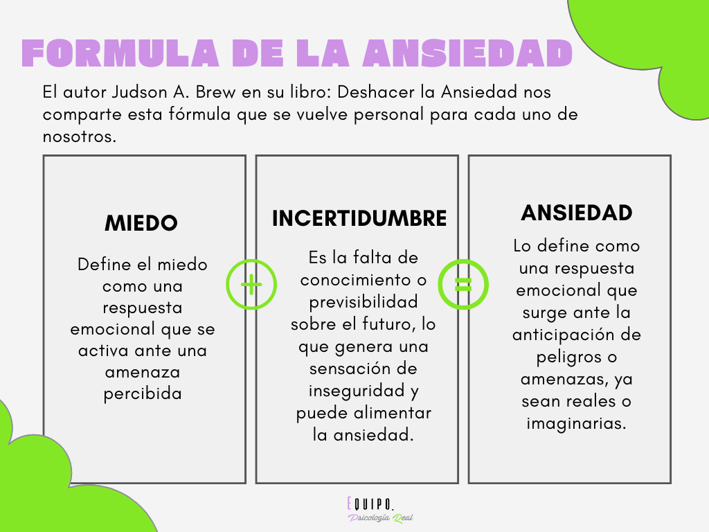 Esto nos lleva a encontrarnos con una formula que nos explica el Dr Judson A. Brew en su libro Deshacer la Ansiedad donde nos comparte que el miedo a lo que pueda ocurrir más la incertidumbre como esa falta de conocimiento hacia el futuro nos lleva a la Ansiedad.